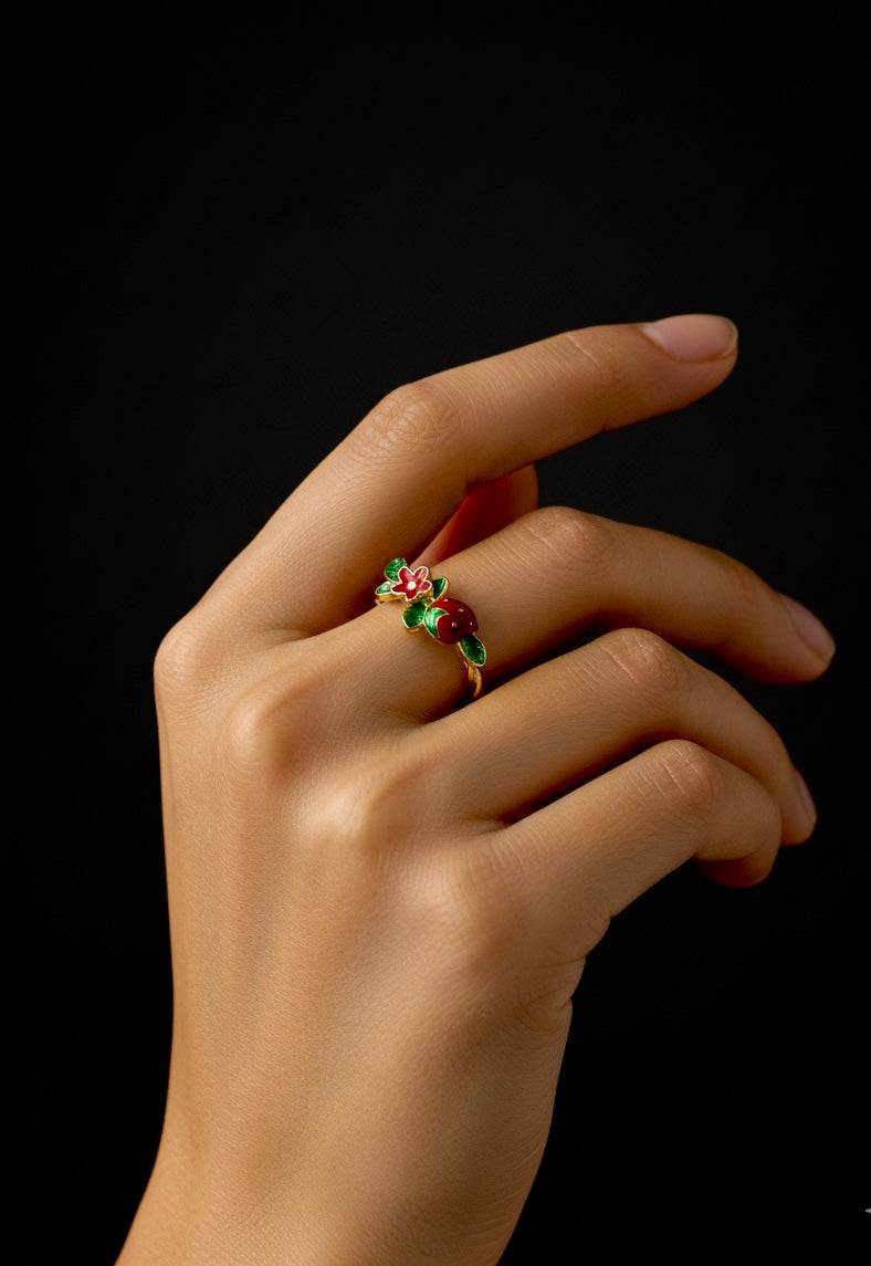 Strawberry-inspired ring with glossy enamel detail; playful and fresh.
