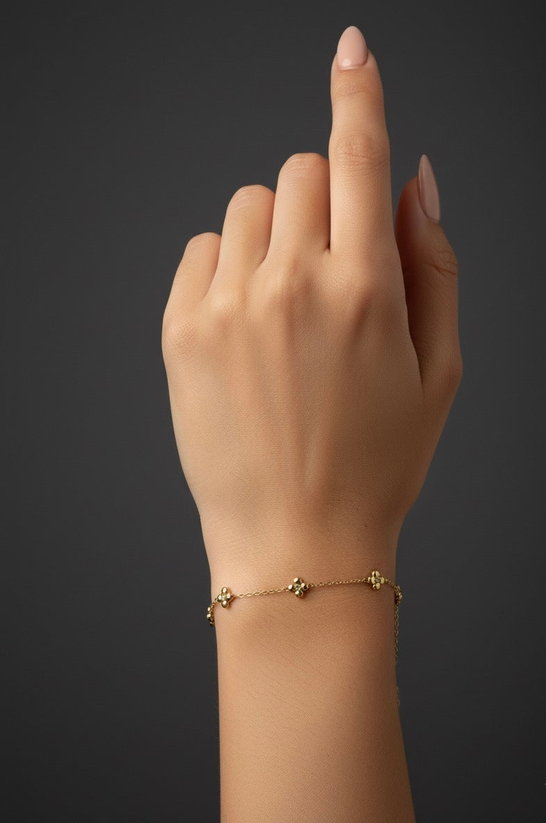Minimal bracelet with tiny enamel clover charm; playful yet elegant.