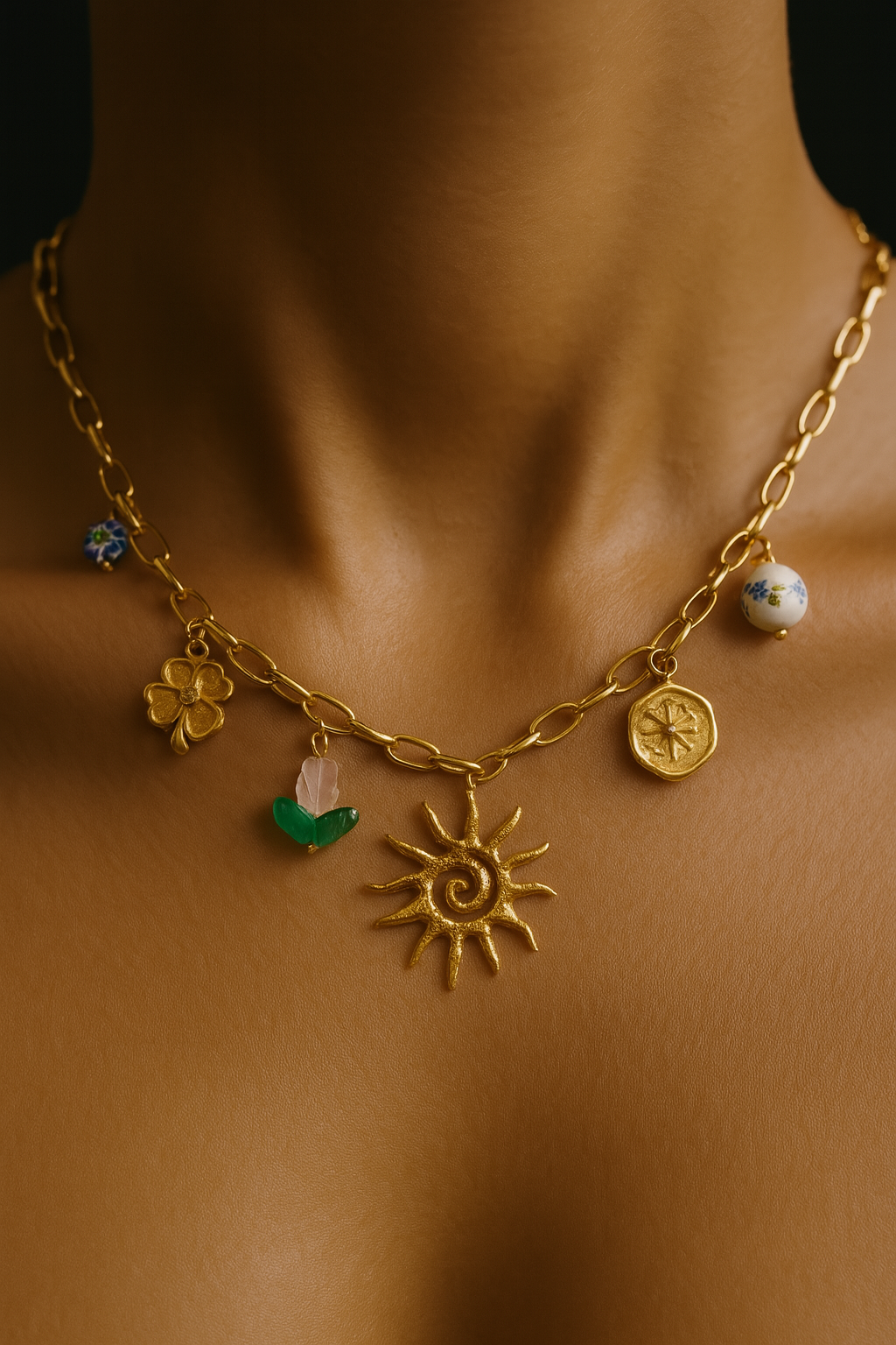 Infused with celestial energy and earthy whimsy, the Solar Soul Charm Necklace is a statement of individuality and intention. Crafted on a chunky yet lightweight gold link chain, this piece features an enchanting mix of handpicked charms: