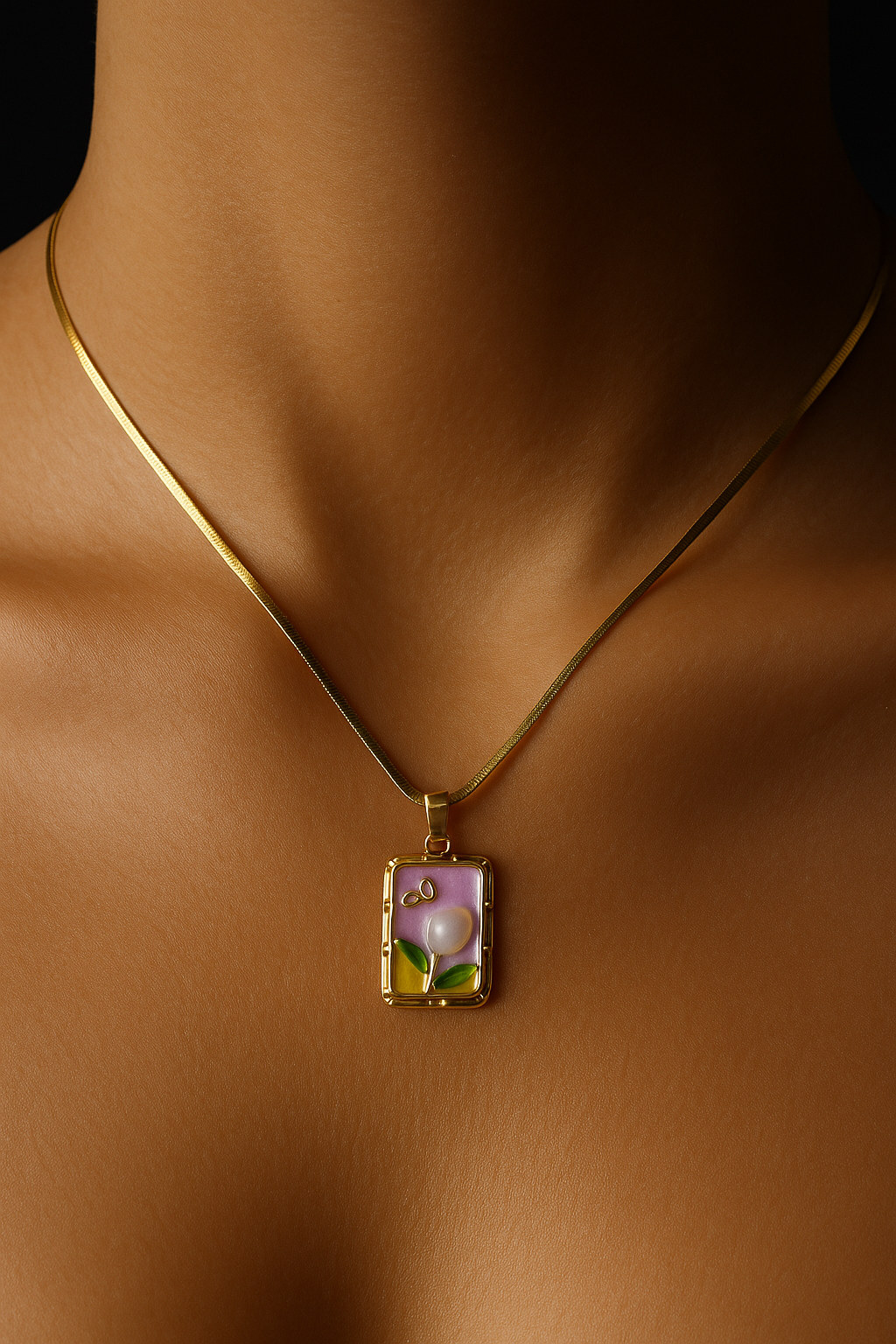 Delicate and dreamy, the Lavender Window Necklace captures the quiet elegance of nature in full blossom. Featuring a soft gold-toned chain and a rectangular charm adorned with a hand-painted lavender flower, this piece evokes serenity, femininity, and artistic charm.